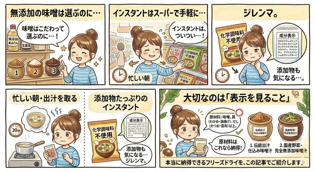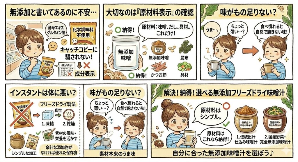 無添加のフリーズドライ味噌汁を選びたいと思っても、「何を基準に選べばいいのかわからない」と感じる人は多いのではないでしょうか。実際、「無添加風」の商品も多く、迷ってしまうのが現実です。